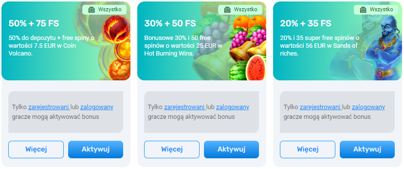 | Pierwszy depozyt | 70 złotych | 50% + 75 darmowych spinów w slocie Coin Volcano | х35 | 9 złotych |
